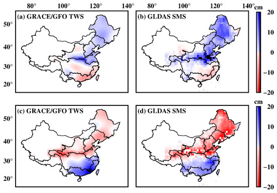 During the 2020–2023 La Niña event, northern China experienced much more water storage, particularly in July 2021, with TWS measuring at 6.16 cm of equivalent water height (EWH), equivalent to approximately 168.78 km3, and SMS at 6.83 cm, amounting to 187.14 km3, when compared to normal conditions. In contrast, southern China witnessed reduced water storage, notably in September 2022, with TWS at −7.01 cm EWH, equivalent to −176.65 km3, and SMS at −4.14 cm EWH, equal to −104.33 km3, compared to normal conditions. The spatial distribution of GRACE/GFO TWS anomalies and GLDAS SMS anomalies across China reveals a reversed pattern (as shown in Figure 11a,b). This pattern is characterized by anti-phased water storage anomalies between southern and northern China, commonly referred to as the “southern drought and northern flooding” pattern. In Section 3.2, we found that the interannual variations in TWS are predominantly attributed to the fluctuations in SMS. GLDAS SMS is simulated within a maximum depth of 2.0 m and is notably influenced by precipitation. During the La Niña years, the northward shift of the subtropical high pressure would foster the development of a rainy atmospheric circulation in northern China during the flood season and cause more rainfall in northern China, which can heighten the risk of flood disasters; conversely, the reduced precipitation in southern China can make these regions more susceptible to drought events [61,62,63].