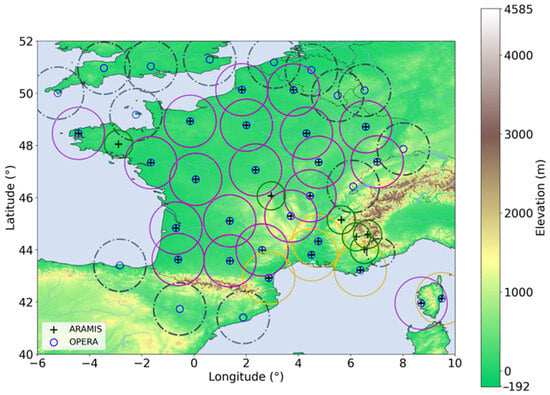 The “European Operational Program for Exchange of weather RAdar information” (OPERA) was established in 1999 and constituted of 30 member states operating over 200 radars in the C-, X- and S-band []. The goal of this program is to organise a European cooperation of radar-products exchange with the help of the European national weather services and to build radar composites for the European Meteorological Network EUMETNET []. Hence, it is worth noting that the French ARAMIS radar network serves as a foundation of the radar coverage for OPERA over France, with the notable exceptions of the X-band radars that are not included; the locations are given in Figure 1. The processing and corrections made on the radar composites can be synthesised in 4 steps: