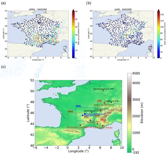 Figure 2a shows that the precipitations of the April case were mainly important over the mountainous areas, such as over the west of the Massif Central (WMC), South Alps (SAL), Durance valley (DUR), Cévennes (CEV), and Jura (JUR) (see Figure 2c for localisation) where the highest accumulations, respectively, observed were 75.9 mm at Montredon-Labessonnié (43.72° N, 2.33° E), 59.5 mm at Comps-sur-Artuby (43.66° N, 6.47° E), 62.4 mm at Apt (43.88° N, 5.40° E), 85.1 mm at Barnas (44.67° N, 4.17° E), and 31.8 mm at Ballon de Servance (47.83° N, 6.79° E). The median accumulated precipitations recorded over the mentioned regions were 26.6 mm, 31.4 mm, 23.5 mm, 22.3 mm, and 25.4 mm over WMC, SAL, DUR, CEV, and JUR, respectively.