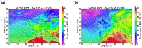 ECMWF ERA5 synoptic conditions on the 23 April 2022 at 12:00 UTC (a) and the 26 June 2022 at 06:00 UTC; (b) the temperature at 1000 hPa (in colours), the mean sea-level pressure (hPa) (white solid lines), and the 500 hPa geopotential (in m2 s−2, dashed grey lines).