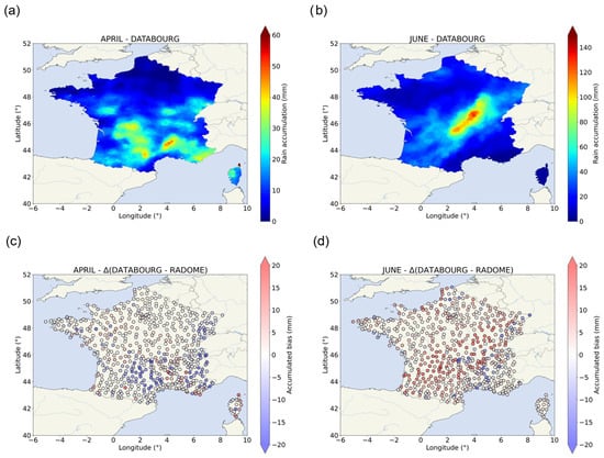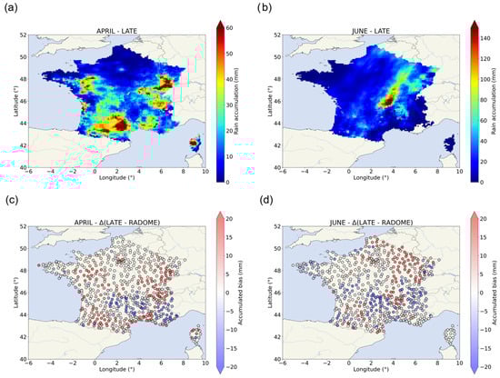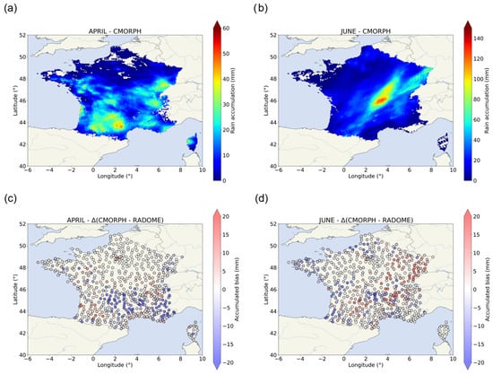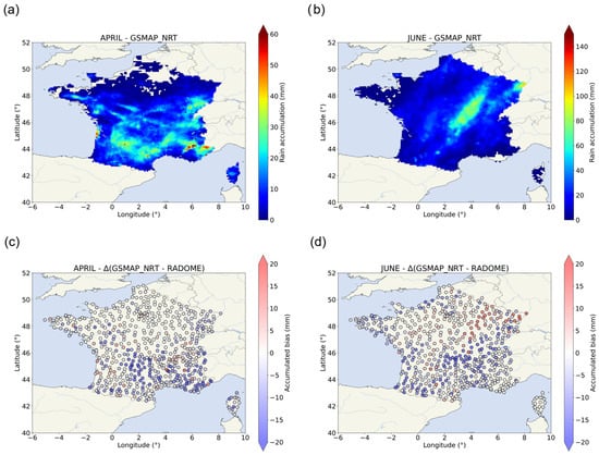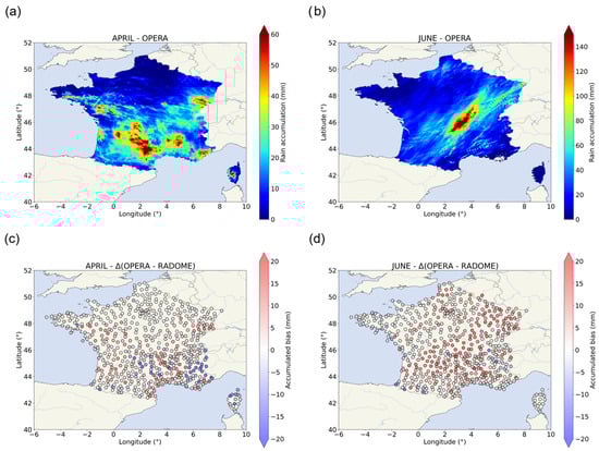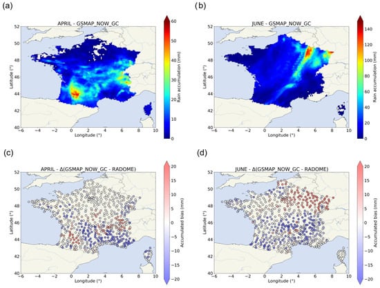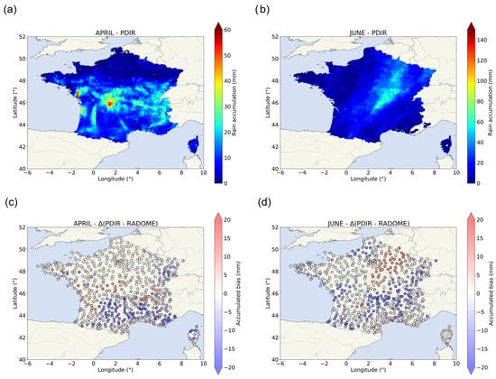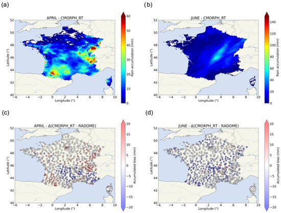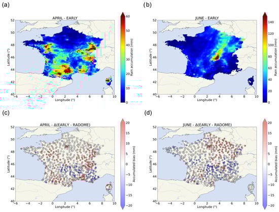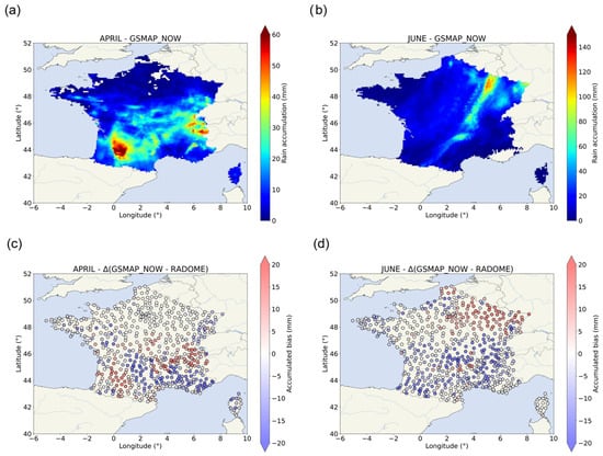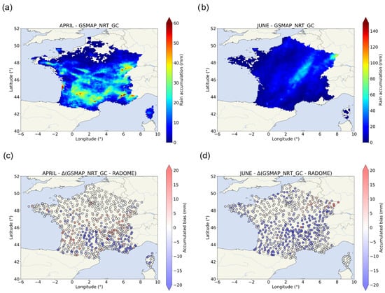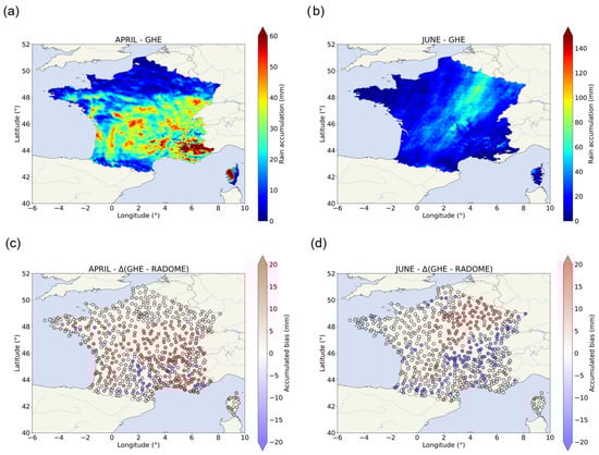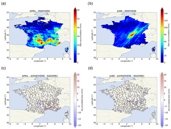 Precipitation accumulation estimated by PANTHERE from the observations of the ARAMIS radars network at the end of (a) the April case and (b) the June case. Absolute biases with the RADOME precipitation gauges network using the point-to-pixel approach are also represented for both (c) the April case and (d) June case.