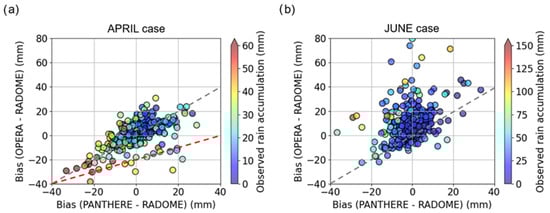 For the June event, PANTHERE detected a localized high-intensity precipitation pattern over the north of the Massif Central (NMC area) extended on a southwest–northeast axis (Figure 4b), as RADOME. The maximum of precipitation accumulation estimated by PANTHERE over NMC was 204.60 mm and was located 74.64 km away from the rain maximum captured by RADOME (Table 2). However, the median of the rain accumulation for the NMC area (35.0 mm) was close to the RADOME one (35.7 mm) for this event. We can see that the main differences in the rain distribution between RADOME and PANTHERE were, as for the April case, located over the reliefs of the Massif Central area (Figure 4d). The mean bias computed for the NMC area was equal to −0.73 mm (Table 3) and an underestimation of −29 mm was recorded at the Chastreix RADOME station.