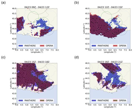 In this study, data from two radar networks were used: the Météo-France PANTHERE rain-rate composite product [,] and the OPERA pan-European composite product []. Both of these products are mainly based on observations from the national radar network when focussing on rainy events over France but some differences exist in data treatments or instruments, which can impact the rain estimates.