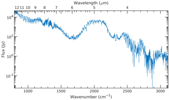 The Jupiter ISO/SWS spectrum used in this study, shown in Figure 1, was recorded on 12 April 1996 by the ISO’s SWS [17,18] instrument, with the aperture (14″ × 20″ below 12 µm, 14″ × 27″ above) centered on the planetary disk, with the long axis aligned perpendicular to the ecliptic, roughly aligned with the central meridian (polar angle = 352°) (Figure 2). The exposure time was 110 min [19], covering planetographic latitudes in the range of approximately ±33° and longitudes in the range of approximately ±22° from the central meridian [20]. More details about the reduction, calibration and uncertainties are given in [12,18]. The absolute flux accuracy is about 20% [18,19] and, for this reason, this is the relative error assumed for the observations in this work unless the error is smaller than 300 Jy (0.668 nW cm sr cm), then we assume it to be 300 Jy. This error limit was provided to us by Dr. Thérèse Encrenaz (private communication). The grating spectrum was convolved to a resolving power of 1500 over the whole spectral range of ISO’s SWS [19].