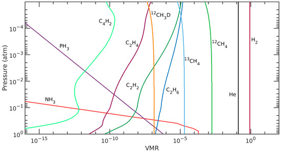 For the 793–1500 cm region, the model atmosphere used in this work consists of NH (ammonia), PH (phosphine), CH (acetylene), CH (ethylene), CH (ethane), CH (diacetylene), He (helium), H (hydrogen gas), CH (methane-12C), CH (methane-13C) and CHD (deuteriomethane 1). The molecular profiles used in this work are from Irwin et al. [23], with the vertical chemical abundance profiles shown in Figure 3.