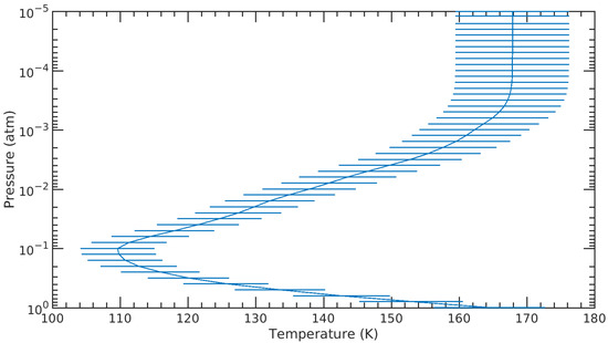 The a priori temperature profile used is from Sada et al. [3], assuming a 5% a priori uncertainty. The profile is shown in Figure 4. For the 1500–2499 cm region, the temperature profile used is the one retrieved from the smaller wavenumber region, adiabatically extrapolated downwards to 10 atm.