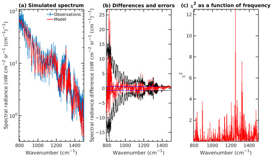 In Equation (1), N is the total number of distinct wavenumber values that make up the spectrum, is the observed radiance value at a specific wavenumber, is the radiance value of the fit at the same wavenumber and is the associated observation error at that same wavenumber.