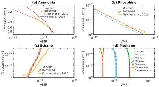 In Figure 8, we show the a priori profiles and our retrieved profiles and compare them with other profiles from various other works for the 793–1500 cm region. Plot (a) shows our retrieved NH profile and how it compares with the profiles found in Fletcher et al. [7] and Melin et al. [10]. Our retrieved profile follows the profile from Fletcher et al. [7] from 0.4 to 0.8 atm more closely than the one from Melin et al. [10]. Plot (b) shows our retrieved PH and that it only coincides with the one from Fletcher et al. [7] near 1 atm and 0.3 atm. The profile from Fletcher et al. [7] has a higher “knee” pressure level and a faster decrease in abundance than the one we retrieved. Plot (c) shows our retrieved CH profile and that the profile from Fouchet et al. [5] has a higher VMR than the one we retrieved for pressures <0.1 atm and a smaller VMR for pressures >0.1 atm. Plot (d) shows our retrieved CH and CHD profiles. The a priori of CH matches the one from Sada et al. very closely [3]. The CH closely follows the a priori profile, with it being within the error bars. The retrieved CHD profile follows the one from Parkinson et al. [6] more closely than the a priori one for pressures higher than 10 atm.