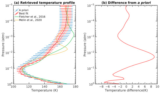 We show, in Figure 9, our retrieved temperature–pressure profile and compare it with other results from the literature, as well as how the temperature profile changed after the retrieval. Our retrieved profile is colder from 1 to 0.1 atm when compared with the used a priori profile Sada et al. [3], as well as the Fletcher et al. [7] and Melin et al. [10] profiles. From 0.1 to 0.01 atm, the retrieved profile follows the temperature profile from Fletcher et al. more closely [7]. For higher altitudes, the retrieved profile starts to converge towards the a priori profile from Sada et al. [3], with the error bars increasing in size. Our retrieved profile does not show the increase in temperature near 0.01 atm found in the equatorial profile from Melin et al. [10], nor the increase in temperature at 0.001 atm from the various profiles found in Fletcher et al. [7].