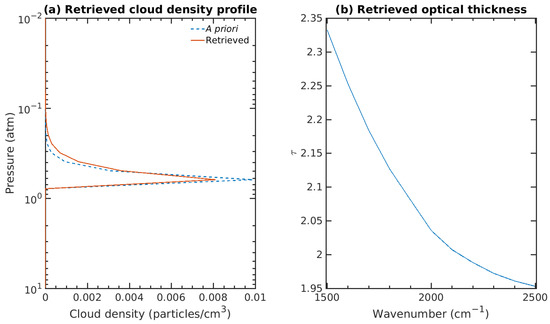 In Figure 10a, we show our retrieved NH cloud density profile for the 1500–2499 cm region and how it compares with the a priori cloud density profile. Plot (b) shows the retrieved optical thickness values of the NH cloud as a function of wavenumber, with the values ranging from 1.95 to 2.18. The a priori and retrieved parameter values to model the NH cloud are given in Table 2. The cloud base altitude was fixed at 6 ± 10 km above where the pressure is 1 atm (0.77 atm).