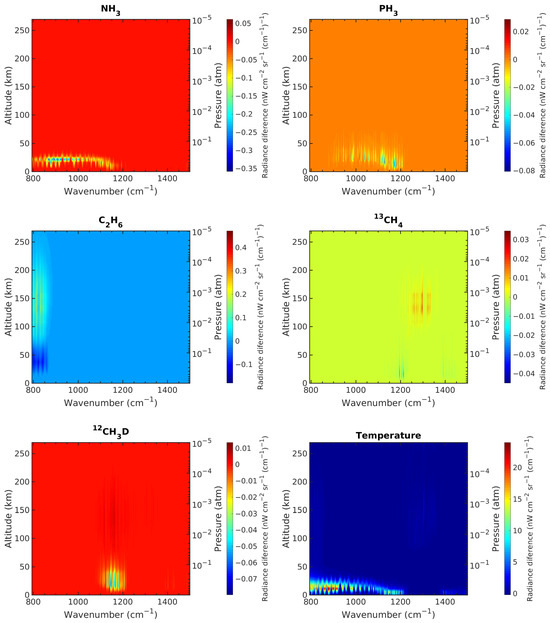 Figure 11 shows our partial differences analysis for all the molecules of interest, as well as for temperature. From these, we show that the most intense absorptions/emissions are due to NH, PH, CH and methane. Absorption due to NH and PH occurs from 793 to 1200 cm around the 0.4 atm pressure level, with faint absorption from CH near 1200 cm and less in the 1400 to 1500 cm region and absorption due to CHD present between 1100 and 1200 cm below 0.1 atm. From 1200 to 1400 cm, we have CH emission from 0.01 to 0.0001 atm, as well as some CHD emission around 1150 cm. CH absorptions/emissions are limited to the 793 to 900 cm region, with absorption happening around 0.3 atm and turning into emission at higher altitudes in the atmosphere. The temperature plot is sensitive to all the absorptions/emissions due to the molecules that make up the model, leading to absorptions/emissions appearing in the plot in the same regions of the wavenumber spectrum and pressure level. An increase in temperature makes these regions appear brighter, regardless of whether there is emission or absorption. These plots show what altitude levels we are sounding for each of the parameters we retrieved and to what part of the spectrum they correspond.