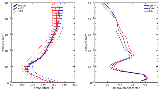 In Figure 12, we show our bracketing analysis on the a priori temperature profile. We increased and decreased the original a priori profile from Sada et al. [3] by 10 K and performed retrievals to see if the profile still converged to a similar temperature–pressure profile as the one we obtained. Despite some slight differences, they are within the error bars of each other, with the biggest discrepancies happening near the tropopause and beyond 0.001 atm. The other plot (right) shows the improvement factor for the three profiles, which, once again, are very similar to each other. The hottest profile shows the smallest improvement factor of the three, while the coldest one shows the largest improvement factor until up to 10 atm, where the coldest profile starts having the worst improvement factor of the three and the hottest profile the best of the three. The important thing to note here is how the improvement factor decreases beyond the 0.02 atm pressure level and when nearing the tropopause. This indicates that we are not sensitive to these pressure levels in particular and are most sensitive to levels around 100 s of mbar.