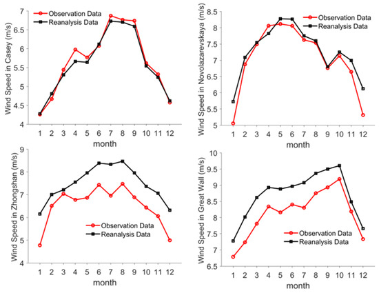 At the Zhongshan Station (as shown in Figure 4b), the peak wind power occurs from July to August, reaching 280 W/m2, and the trough occurs in January at around 114 W/m2. The annual wind power density was generally above 100 W/m2, with an average annual wind power density of 200 W/m2. Zhongshan Station had abundant wind power density resources throughout the year and it was even closer to the rich range from June to August.