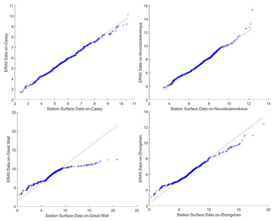 Antarctic station ERA5 data and measured station wind speed data quantile-quantile plot.