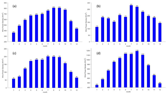 At Taishan Station (as shown in Figure 4d), the peak wind power density appears from June to September, reaching more than 1100 W/m2, and the trough appears from December to January, at levels below 450 W/m2. The wind power density reaches over 800 W/m2 for more than half months of the year, with an average annual wind power density of 860 W/m2. Nearly half of the months of the year had a wind power density of over 800 W/m2, which is firmly in the twice superb range.