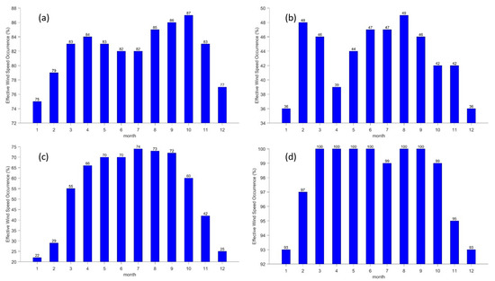 Monthly variation characteristics of effective wind speeds occurrence at the Antarctic stations. (a–d) refer to Great Wall Station, Zhongshan Station, Kunlun Station and Mount Taishan Station, respectively.