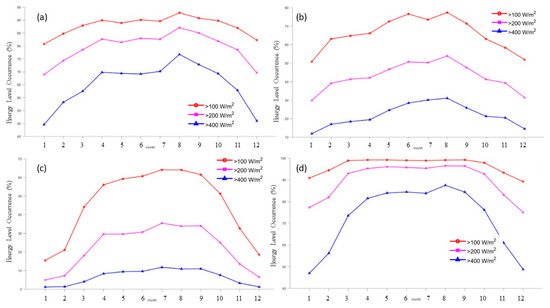 Energy level classification is a useful tool for assessing wind energy levels at stations. It is generally believed that a wind power density of above 100 W/m2 is in the available range, while a wind power density of above 200 W/m2 is abundant. According to the statistical analysis, energy level frequencies for each month at the four stations above 100 W/m2 indicate an Available Level Occurrence (ALO), frequencies above 200 W/m2 indicate a Rich Level Occurrence (RLO) and frequencies above 400 W/m2 indicate a Superb Level Occurrence (SLO). These are shown in Figure 6.