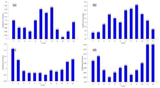 Monthly variation characteristics of coefficient of variation at Antarctic stations. (a–d) refer to Great Wall Station, Zhongshan Station, Kunlun Station and Mount Taishan Station, respectively.