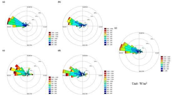 Figure 11 illustrates the stability of wind energy at Taishan Station. The average annual wind power density was consistent with northeastern winds, accounting for 100% of the total wind energy. Additionally, Taishan Station has relatively strong wind power density, with a frequency exceeding 1500 W/m2 and a maximum contribution of wind energy ranging from 600 to 1200 W/m2. The dominant wind direction was stable, providing abundant wind energy resources that are conducive to its development and utilization. Wind power generation and other activities can be carried out in this area. However, Taishan Station’s wind energy resources are weakest during summer and strongest during winter and spring.