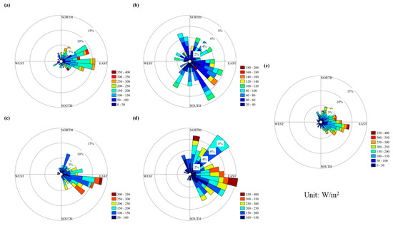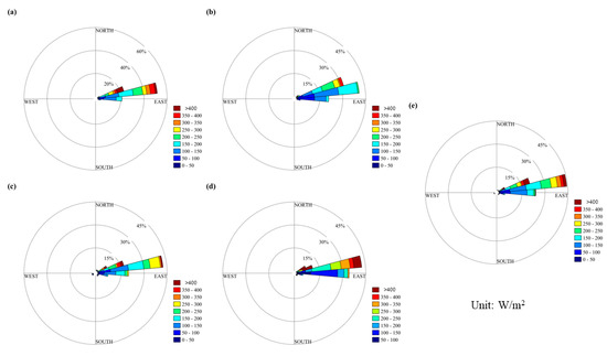 The wind energy at Kunlun Station was unstable, as seen in Figure 10. The annual average wind power density exists from northeast to southeast, with the strongest wind energy direction being easterly. The low intensity of the wind energy hinders its development and utilization. The seasonal wind energy rose diagram indicates that the direction of wind energy in spring was relatively stable, while summer was the most unstable and had the weakest wind power density. In winter, the wind energy direction was also unstable, with strong winds mostly occurring in the easterly direction, accounting for 20% of the total wind energy. The wind power density was mostly 100~200 W/m2.