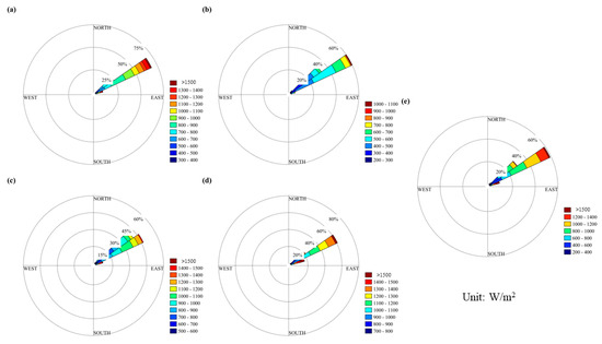 Wind energy rose graphs for the Kunlun Station. (a–e) represent spring, summer, autumn, winter and the entire year.