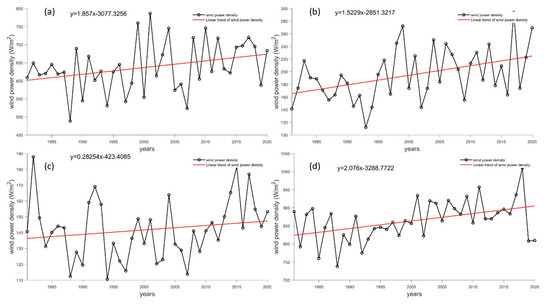Long-term trends in wind power density at Antarctic stations (unit: W/m2·yr−1). (a–d) refer to the Great Wall Station, Zhongshan Station, Kunlun Station and Mount Taishan Station, respectively. The black line represents reanalysis data, while the red line represents a linear fitting trend.