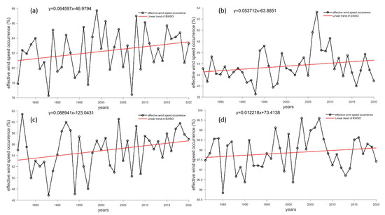 Long-term trends in effective wind speed occurrence at Antarctic stations (unit: %/yr). (a–d) refer to the Great Wall Station, Zhongshan Station, Kunlun Station and Mount Taishan Station, respectively. The black line represents reanalysis data, while the red line represents a linear fitting trend.