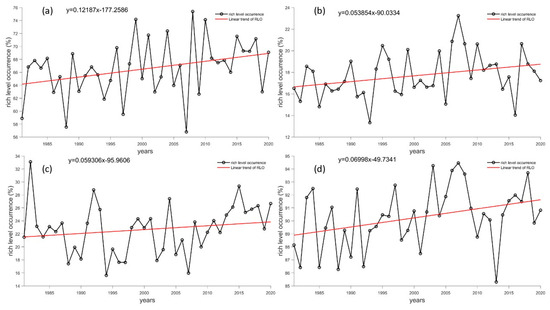 Long-term trends in RLO at Antarctic stations (unit: %/yr). (a–d) refer to the Great Wall Station, Zhongshan Station, Kunlun Station and Mount Taishan Station, respectively. The black line represents reanalysis data, while the red line represents a linear fitting trend.