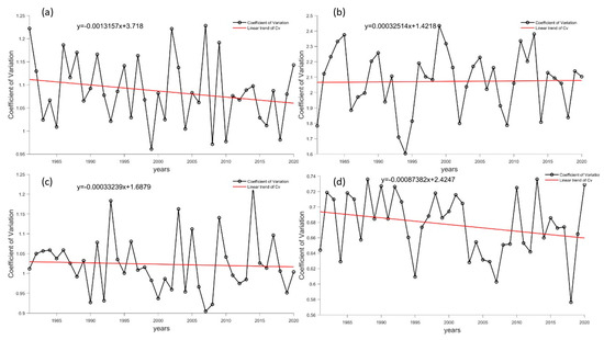 Long-term trends in Cv at Antarctic stations. (a–d) refer to the Great Wall Station, Zhongshan Station, Kunlun Station and Mount Taishan Station, respectively. The black line represents reanalysis data, while the red line represents a linear fitting trend.