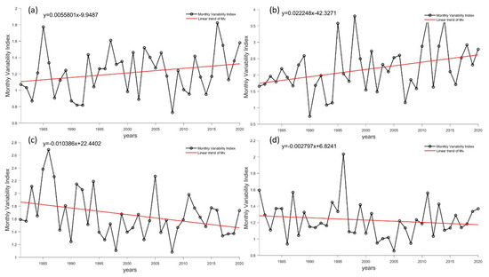 Long-term trends in Mv at Antarctic stations. (a–d) refer to the Great Wall Station, Zhongshan Station, Kunlun Station and Mount Taishan Station, respectively. The black line represents reanalysis data, while the red line represents a linear fitting trend.