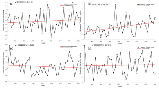 Long-term trends in Sv at Antarctic stations. (a–d) refer to the Great Wall Station, Zhongshan Station, Kunlun Station and Mount Taishan Station, respectively. The black line represents reanalysis data, while the red line represents a linear fitting trend.