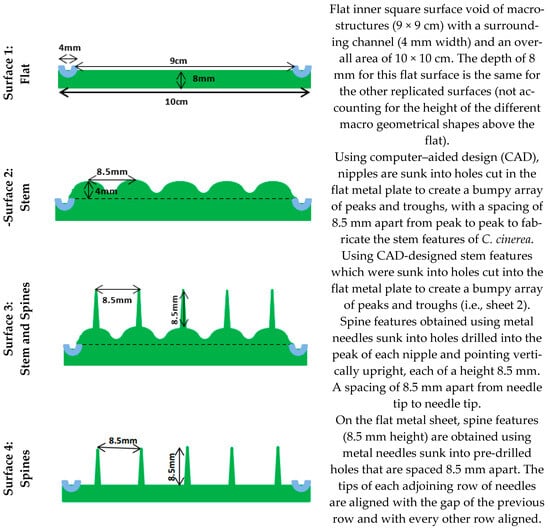 Utilizing the surface measurements of C. cinerea (the stem and spines), replicated surfaces of these macro-structures were designed for four different surfaces, namely a flat surface, a stem surface, a surface with an array of spines, and finally, a surface with a combination of both stem and spine features (Figure 2). A channel was also incorporated into the design to ensure that water run-off could be collected and not lost.