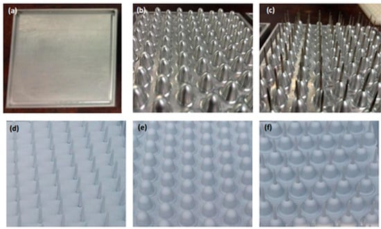 In the same way, steel spines (with spine heights of 8.5 mm) were then machined to ensure that each were of equal length. These spines were then either individually slotted into pre-drilled holes on top of the stem features (Figure 3c) or, alternatively, slotted into the pre-drilled holes on one of the base plates (Figure 3d). To ensure that the dew-harvesting efficiency of these surfaces were maximized and to mitigate any inconsistencies that could occur from having a mix of steel and aluminium, all surfaces were coated with the same materials. Figure 3d–f show these coated surfaces. The coating consisted of five layers. The first was a white etch primer (that is designed for use on aluminium and steel surfaces and adheres to the plates) in preparation for the second layer, which was an undercoat, followed by a third top coating to protect them from the atmosphere. All four sheets then had two more top coatings of white paint mixed with the OPUR additive.