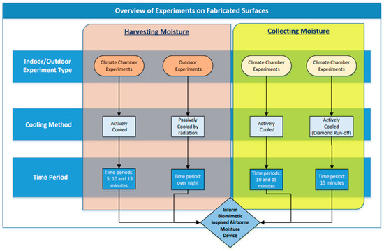 Three different methods were employed to evaluate the potential of the fabricated macro-surfaces as dew harvesters, using a climate chamber and outdoor conditions on dewy nights (Figure 4). These methods included the following:
