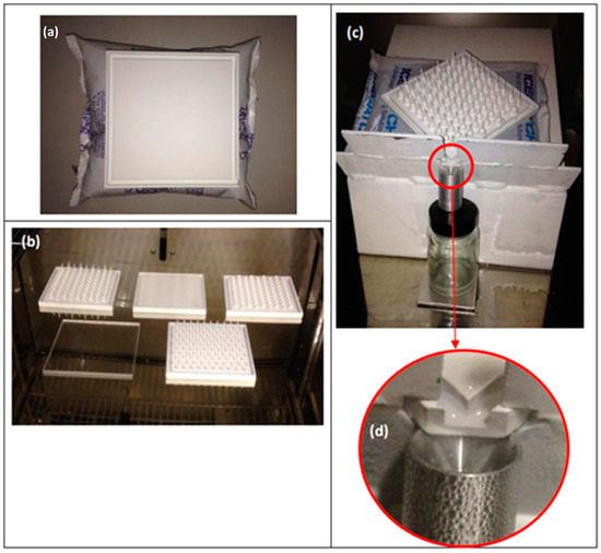 Having designed the surfaces to be fabricated, a flat base structure (see Figure 3a) was made from aluminium for all four surfaces, each with a 4 mm wide surrounding channel. This ensured that all surfaces had the same footprint, with an approximate overall area of 100 cm2. A channel to catch and direct surface water run-off was cut into the perimeter, leaving a 9 × 9 cm inner square surface on which the different replica shapes could then be added. The stem features (of dimensions shown in Figure 2, Surface 2) were first constructed using CAD (computer-aided design) SolidWorks software. These three-dimensional geometric stem shapes were then used by a milling machine that was programmed to follow the computer-aided design to cut the stem shape out of aluminium blocks. This method allowed for the consistency of each stem shape being machined. Once all the stem shapes had been cut, holes were cut into the aluminium base structure (Figure 3a), and the milled aluminium stem features slotted into these pre-drilled holes (Figure 3b).
