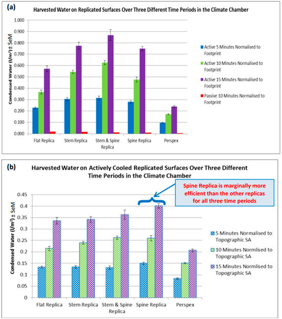 The primary data set for this experiment is presented in Figure 6. As mentioned earlier, harvesting experiments were conducted for three different time periods. For the actively cooled surfaces, three time periods were used: 5, 10, and 15 min. However, for the passive surfaces, data were acquired over a 10 min time period only. This decision was based on the observation that, as expected, minimal surface condensation occurred for the passive replica surfaces within the 10 min timeframe in the climate chamber (Figure 6a) when compared with the actively cooled surfaces. Hence, for the purpose of performance comparison, capturing additional passive data was deemed unnecessary.