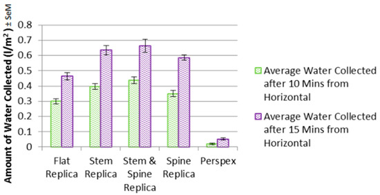 Using the same set-up as in the harvesting experiment, discussed in the previous section, at the end of each time period (in this case, 10 min and 15 min), the surface-condensed water was tipped off each individual surface and measured. It is clear from Figure 7 that more water was collected for each of the surfaces after 15 min than after 10 min, with the stem & spine replica along with the stem replica collecting marginally more than the other replica surfaces. When comparing the stem replica, the stem and spine replica, and the spine replica with the flat reference surface, they are all significantly more efficient at collecting water.
