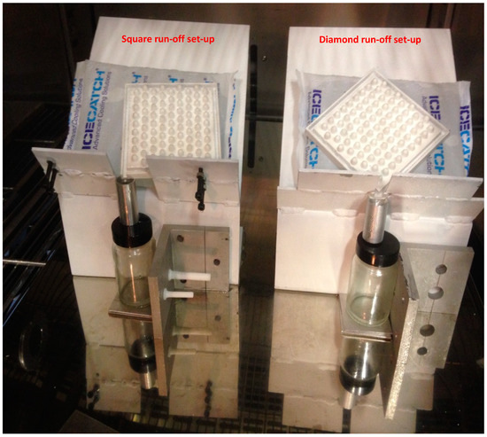 The flow path orientation was also analysed, comparing the diagonal surface water run-off with the parallel water run-off for a square orientated surface (see Figure 5). The square surface had two uppermost corners and two corners at the bottom, with a very slight incline to allow water to run into a collection pot along the lower channel. The diamond-orientated surface had one corner pointing vertically upward, with its diagonally opposite corner pointing vertically downwards and positioned above a collection pot.