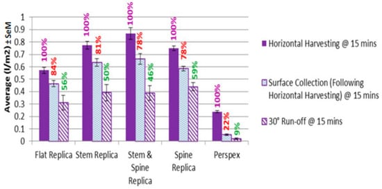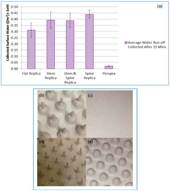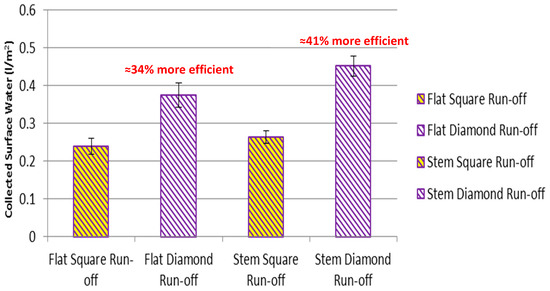 It can be seen in Figure 9 that the level of collected surface water (L/m2) from the different surfaces are distinct with small error bars. There is a clear trend between the surface water collected when the surface under investigation is orientated in a square manner compared to when the same surface is placed in the diamond orientation. Figure 9 illustrates the notable increase in the efficiency of collected water for the diamond configuration for both a flat surface and the stem replica surface. For this reason, the remining run-off experiments in this study used the diamond orientation set-up.