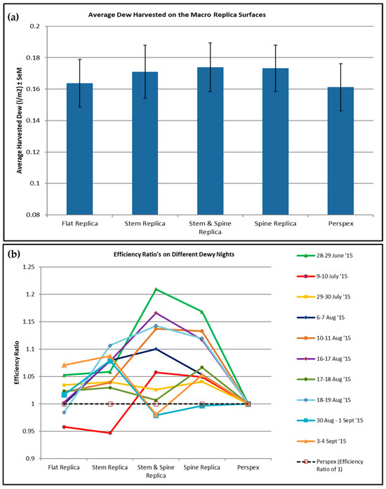 Dew-harvesting data of replicated macro-surfaces: (a) graph illustrating the average dew in L/m2 ± SeM for the replica surfaces; (b) graph illustrating the efficiency ratio of the replica surfaces over different dewy nights compared with the Perspex control.
