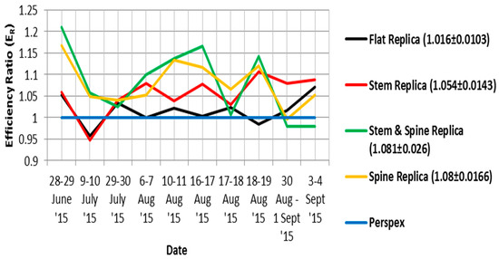 Each night of data collection was also plotted to assess the trend of efficiency compared against the Perspex sheet (i.e., the line graphs in Figure 12b). Hence, the Perspex always had an efficiency ratio (ER) of 1. The stem & spine replica had the highest average efficiency ratio of 1.081 ± 0.026, followed by the spine replica, the stem replica, and finally the flat replica, with average efficiency ratios of 1.080 ± 0.017, 1.054 ± 0.014, and 1.016 ± 0.010, respectively. Looking at the data set for each of the dewy nights recorded, the flat replica had a lower efficiency ratio than the Perspex on three of the recorded nights and the stem & spine replica on two nights, and the stem recorded one ER lower than the Perspex, as did the spine replica.