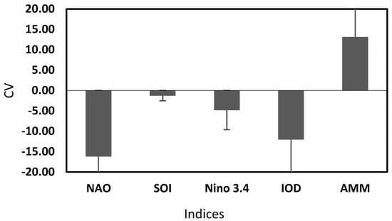 The coefficient of variation (CV), defined as the most common statistical tool, captures the dispersion in the data relative to the mean as the standard deviation divided by the mean [46] and measures the variability in a series of numbers independently of the measurement unit used for this process [47]. The monthly CV of the time series of the given indices has been adopted to evaluate and assess their variability. Figure 1 and Table 2 reveal a highly positive value for the AMM of 13.4 (it is the only index with a positive CV value). In contrast, the remaining indices indicate negative values ranging from −1.26 to −16.18 during the study period. A negative CV value is due to a negative value of the mean. It is advised to utilize the mean without sign module for improved CV comparison. As a result, the index CVs are positive. These results show a relatively high variability in the time series of all indices, especially the NAO, IOD, and AMM indices, because the CV is greater than 1. The degree of uniformity and the consistency in the distribution of the index datasets indicate that the NAO, IOD, and AMM climatic indices are less uniform and less consistent than the SOI and ENSO. The standard deviation of the monthly variation listed in Table 2 indicates slightly positive values (ranging from 0.32 to 2.51) for most of the climate indices with consistent relationships. Although there is no notable difference in the standard deviation, there are large differences in the CV due its high sensitivity to the average.