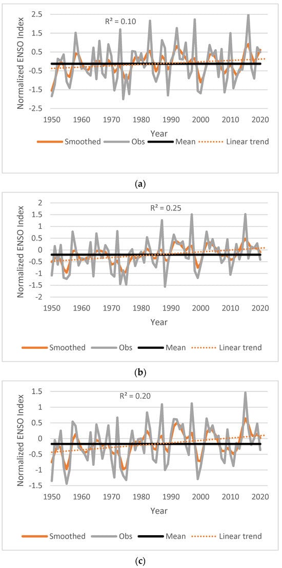 The trend analysis using the running mean filtering method in the ENSO index (Figure 2a–c) show that the smoothed and observational time series continue to exhibit a favorable match in the winter, summer, and annual results. In addition, this indicates an increasing trend in the ENSO index during the study period (1950–2020). The trends of the time series of the ENSO (Nino 3.4) in the annual, summer and winter data range from positive to negative trends. The linear trends increase on an annual basis and during the summer and winter seasons but not significantly, with R2 values less than 0.25. In general, one can show from Figure 2a–c the increase in the ENSO index from mid-1970’s up to the end of study. Increase and decrease in the ENSO index from year to year is observed. El Niño imposes warming effects on the world’s climate, but La Niña imposes an immediate cooling effect, which is often most significant in the year after occurrence. Positive and negative responses that occur naturally through the climate system are among the processes responsible for SST fluctuations in the tropical Pacific [20]. Moreover, El Niño episodes became common in the tropical Pacific throughout the 1980s and 1990s. Furthermore, a significant increase at 95% confidence level in the linear trend is observed in the summer season of ENSO. However, there is no significant increase in the linear trend of ENSO for both winter and annual time series. There remains a lack of knowledge regarding the mechanisms underlying decadal ENSO changes [48].