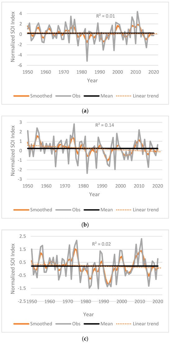 The SOI index indicates a general decreasing trend in the summer and annual time series (Figure 3b,c), while in contrast, no changes are detected in the winter long-range trend, as shown in Figure 3a. Additionally, the smoothed and observational time series fluctuations are acceptable with positive and negative values throughout the study period. The decreasing linear trends in the SOI index in the annual, summer and winter time series are not significant because is less than 14%. From the definition of the SOI, the positive phase represents an above-normal air pressure in Tahiti and a below-normal air pressure in Darwin. Long durations of positive (negative) SOI values correspond with the unusually cold (warm) ocean waters that are characteristic of La Niña (El Niño) events in the eastern tropical Pacific. Additionally, the Walker circulation strength can be determined by the SOI, which is considered one of the most important atmospheric indicators for determining the intensity of El Niño and La Niña occurrences. Figure 3a–c clearly show a decrease in the SOI from the mid-1970s up to the start or mid-1980s (according to the season) and over the last decade (2010–2020). The Walker circulation seems to be weakening as a result of both a natural increase in the frequency of El Niño events and a natural decrease in the frequency of La Niña events [49,50,51], as well as to a certain extent due to global warming [23,51,52]. Power and Smith examined the possibility that global warming might have contributed to some of the observed decreases in the value of the SOI after 1976 [51]. An increase in the SOI occurs approximately during the period from the mid-1960s to mid-1970s and from the mid-1980s up to the first decade of the 21st century. Power and Kociuba demonstrated that, contrary to expectations, the SOI tends to rise rather than fall during the 21st century [53]. The MSLP tends to rise in Darwin and Tahiti during global warming, while Tahiti tends to exhibit greater increases than Darwin. Tahiti is located in a vast area in which the MSLP tends to increase as a result of global warming. The SOI is thus a highly uncertain indicator of long-term tropical changes related to global warming, despite functioning as a suitable measure of yearly variability in both the equatorial MSLP gradient and the WC. The findings of Power and Kociuba also suggest that internal, naturally occurring variability is the primary cause of the first 21st-century decline in the SOI.