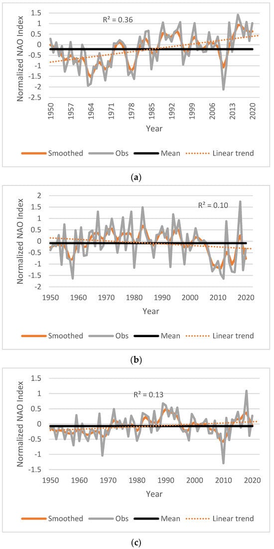 Trend analysis for North Atlantic Oscillation Index (NAO) (a) Winter season, (b) Summer season, and (c) Annual.