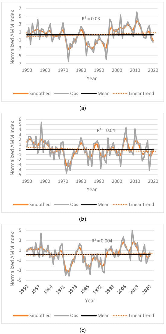 The smoothed AMM time series and the observational time series during the winter with the same sample size also exhibited favorable matching (Figure 5a), beginning with positive values (trends) from 1950 to 1970 and decreasing values during (negative trends) the mid-1970s and 1990s. The remainder of the time series was interspersed with positive trends in 2000 and 2010 and a declining trend at the end of the study period. During the summer season (Figure 5b), the change in AMM starts with positive trends over the first decade during the study period (1950 to 1960) and a declining trend during the 1970s followed by an increasing trend. During the rest of the period, the smoothed time series and the observational time series fluctuated between positive and negative trends in almost identical patterns with a top positive value at the beginning of each decade. The time series depicted in Figure 5c shows the annual variation of AMM with 11 smoothing algorithms. The figure clearly shows that the sample size of the smoothed time series is the same as that of the observational time series. Additionally, it shows that the fluctuation match between both records is satisfactory. The smoothed time series of the AMM starts with a positive value from 1950 to 1970, and thereafter, a significant decreasing trend occurs until approximately the mid-1970s. The remainder of the time series ranges from positive trends in 1980, 1998, 2004 and 2011 to negative trends in 1985 and 1993. Moreover, it gradually increased from the mid-1970s until the end of the period and did not return to its original value, which may be similar to an increase in the surface temperature under global warming. The trend in the wintertime series is approximately similar to the trend in the annual time series of the AMM. Therefore, the wintertime series of the AMM may impose a greater effect on the annual time series of the AMM than the summertime series of the AMM. There are no significant linear trends in the annual, summer and winter time series of the AMM, with an R2 value of approximately zero.