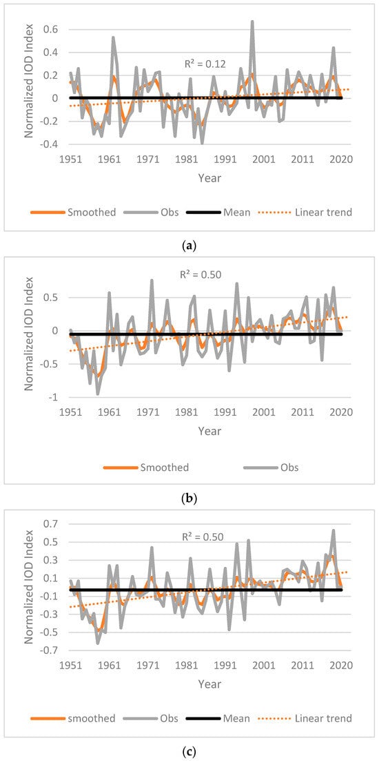 Trend analysis for Indian Ocean Dipole (IOD) (a) Winter season, (b) Summer season, and (c) Annual.
