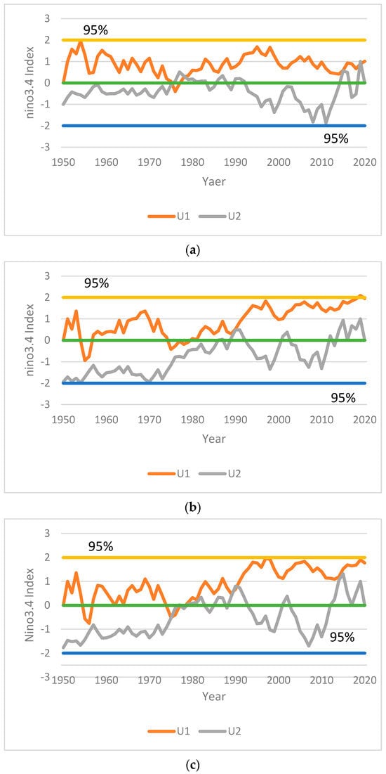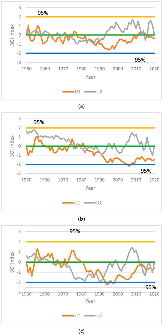 Figure 7a–c show the abrupt change in the ENSO index, which was obtained using the sequential form of the Mann-Kendall test for the winter, summer, and annual seasons (U1 forward sequential statistic and U2 backward sequential statistic, respectively). During the winter season (Figure 7a), there was an abrupt change (decreasing trend) in 1976 and an increasing trend in 1978 and 2019. In 2002 Rodo found a shift in the ENSO in 1976 that may possibly be linked to global warming [64]. Also, Rashid illustrated that forced changes in the ENSO are associated with global warming [65]. The abrupt change in the ENSO index during the summer season (Figure 7b) indicates an increasing trend in 1990 only. Figure 7c shows the Mann–Kendall t test results for the annual ENSO index. This figure illustrates annual positive abrupt changes in 1982, 1991, and 2015 and a negative abrupt change in approximately 1976. Similarly, other studies [66,67,68,69] have detected these changes, and they coupled and identified them with the ENSO cycle-related variability on an interannual timescale, which is also linked to climate change in general. Additionally, the time series are not smooth during the study period.