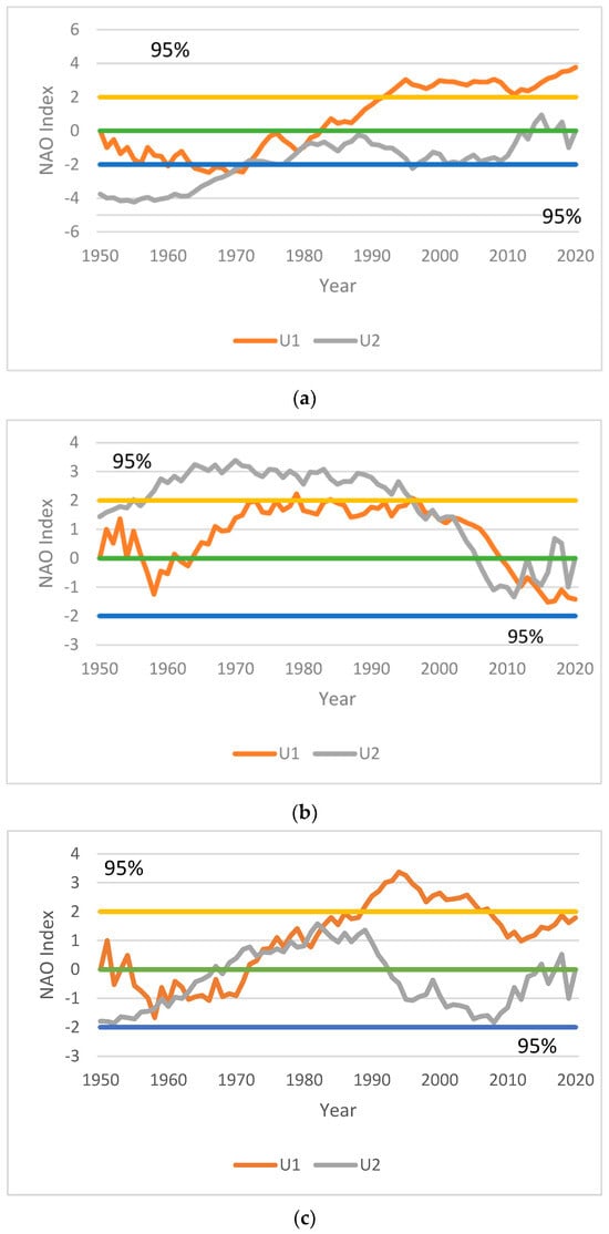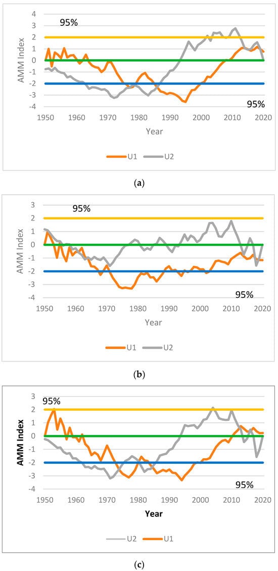 Figure 10a shows the winter season time series that exhibits an increasing trend (abrupt change) in 1977 and a decreasing trend in 2014 and 2019. Figure 10b shows the Mann–Kendall t test results for the AMM on a seasonal (summer) basis. There is an abrupt change (increasing trend) in 1961 and a decreasing trend in 1964 and 2018. Figure 10c shows the Mann–Kendall t test results for the abrupt changes in the AMM on an annual basis. This reveals that abrupt climatic changes occurred at different times during the study period from 1950–2020. An increasing trend abruptly occurred in 1981, 2013, and 2016. These change points in the AMM might be related to the phases of the ENSO cycle. It is proposed that the Pacific and Atlantic modes are similar and controlled by physics essential to the ITCZ [38]. In addition, the episodic changes in climate variabilities accompanied by changes in atmospheric circulation may be linked to changes in the Atlantic Meridional Overturning Circulation (AMOC) [77], which conforms with the AMM structure [78]. The AMOC is an important component of the Earth’s climate system, characterized by a northward flow of warm, salty water in the upper layers of the Atlantic and a southward flow of colder water in the deep Atlantic. Furthermore, changes in this circulation pattern profoundly impact the global climate system, and it is very likely that the strength of the AMOC will decrease over the course of the 21st century in response to increasing levels of greenhouse gases [79,80]. Generally, the annual, summer and winter U1 and U2 vectors share the same patterns except for no abrupt changes during the 1980s in summer.