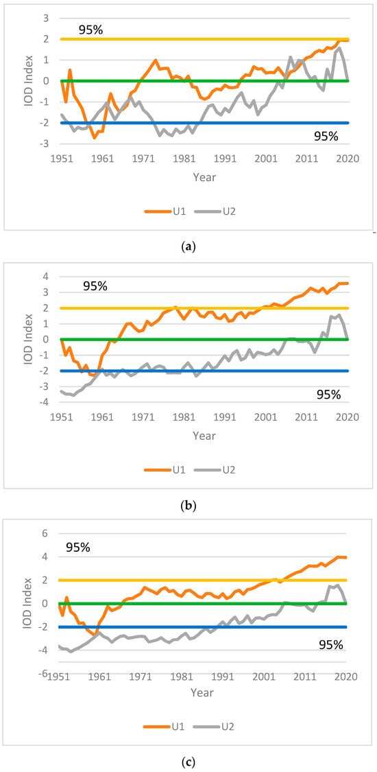 In the case of the IOD, the summer and annual time series show that there are no significant abrupt changes during the study period (Figure 11b,c), while during the winter (Figure 11a), a positive trend is clearly observed involving abrupt changes in the early and mid-60s. Moreover, other positive trend values of abrupt changes occurred in 2006 and 2010. There is evidence that the declining Walker circulation plays a role in the occurrence of these out-of-season IOD events, but more research is necessary. If true, this suggests increased IOD activity and, consequently, increased unseasonable IOD events in a warming world [81].